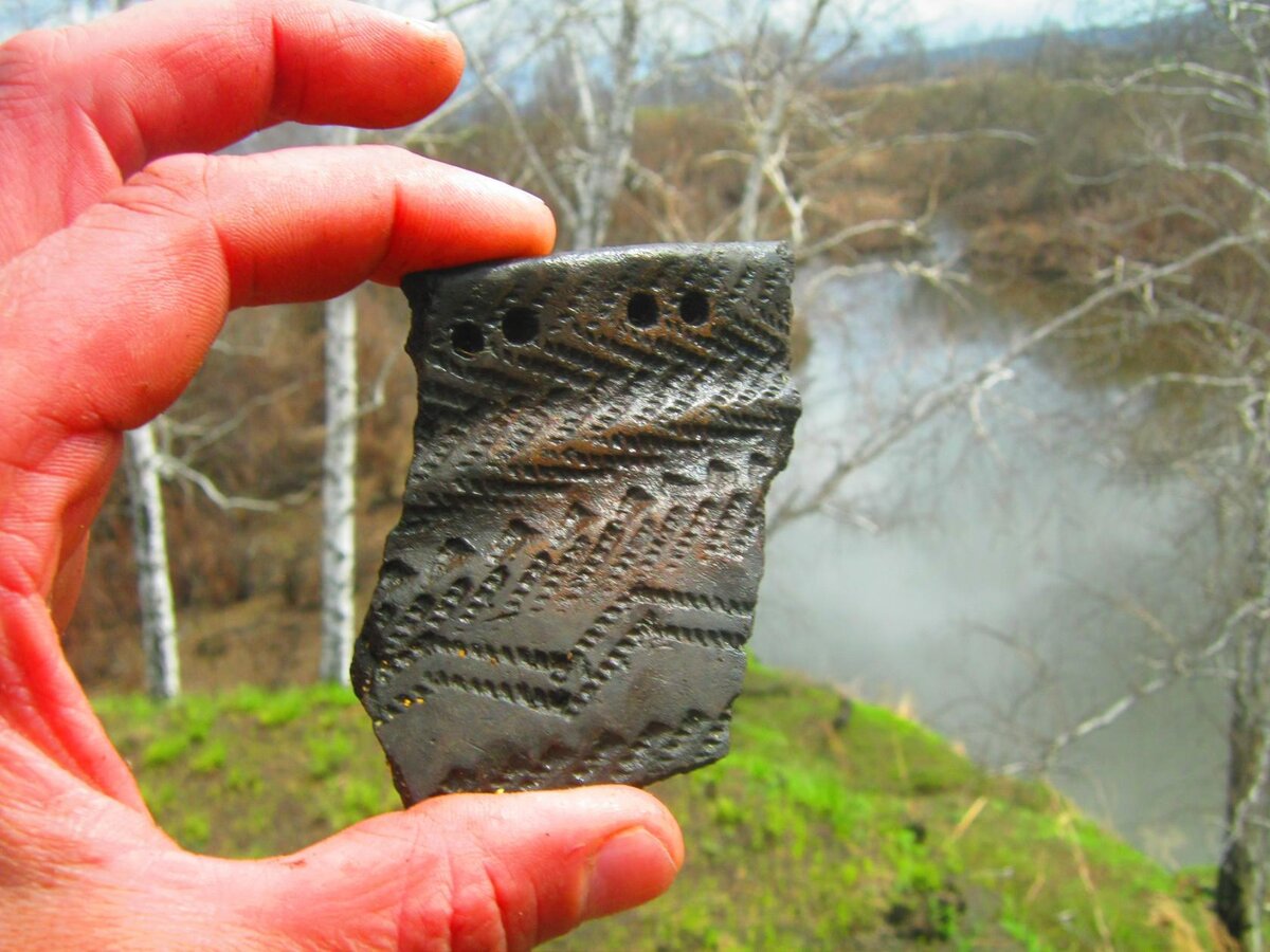 В.В. Гирник с фрагментом керамики поселения в устье реки Дальняя.
