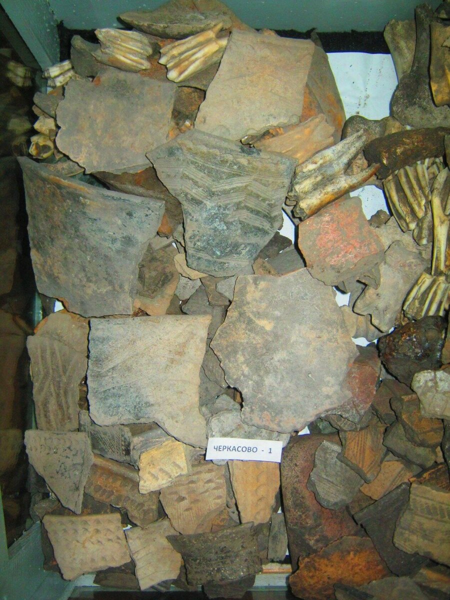 Производство керамики поначалу являлось преимущественно женским делом. Но в эпоху бронзового века наметилась тенденция к выделению профессионального сословия гончаров. Часть из них была мужчинами (30% отпечатков ногтей на сосудах алакульской культуры оставлено мужчинами). Помимо многочисленных фрагментов керамики я нахожу и развалы сосудов (развал – разрушенный керамический сосуд, обломки которого сконцентрированы в одном месте). Два развала сосуда с Миасского городища и с устья реки Дальняя я подарил А.Д. Таирову в коллекцию исторических фондов ЮУрГУ. На донышке одного из них отчетливо прослеживается отпечаток жгутовой основы. Много развалов сосудов археологи находят на территории нашего района при раскопках могильников. К примеру, коллекция сосудов из раскопанного в период 1968-1969 годов алакульского могильника на Крутой речке в совокупности представлена примерно 150 емкостями с остатками заупокойной пищи. Часто мне попадаются керамические и орнаментированные ручки сосудов, а также небольшие глиняные стаканчики.